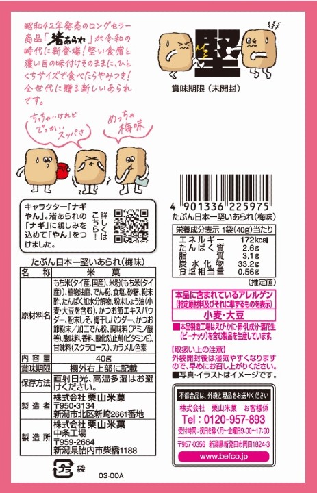 噛むほどに広がる梅の風味とあられの香ばしさで、あと引くおいしさが楽しめます。